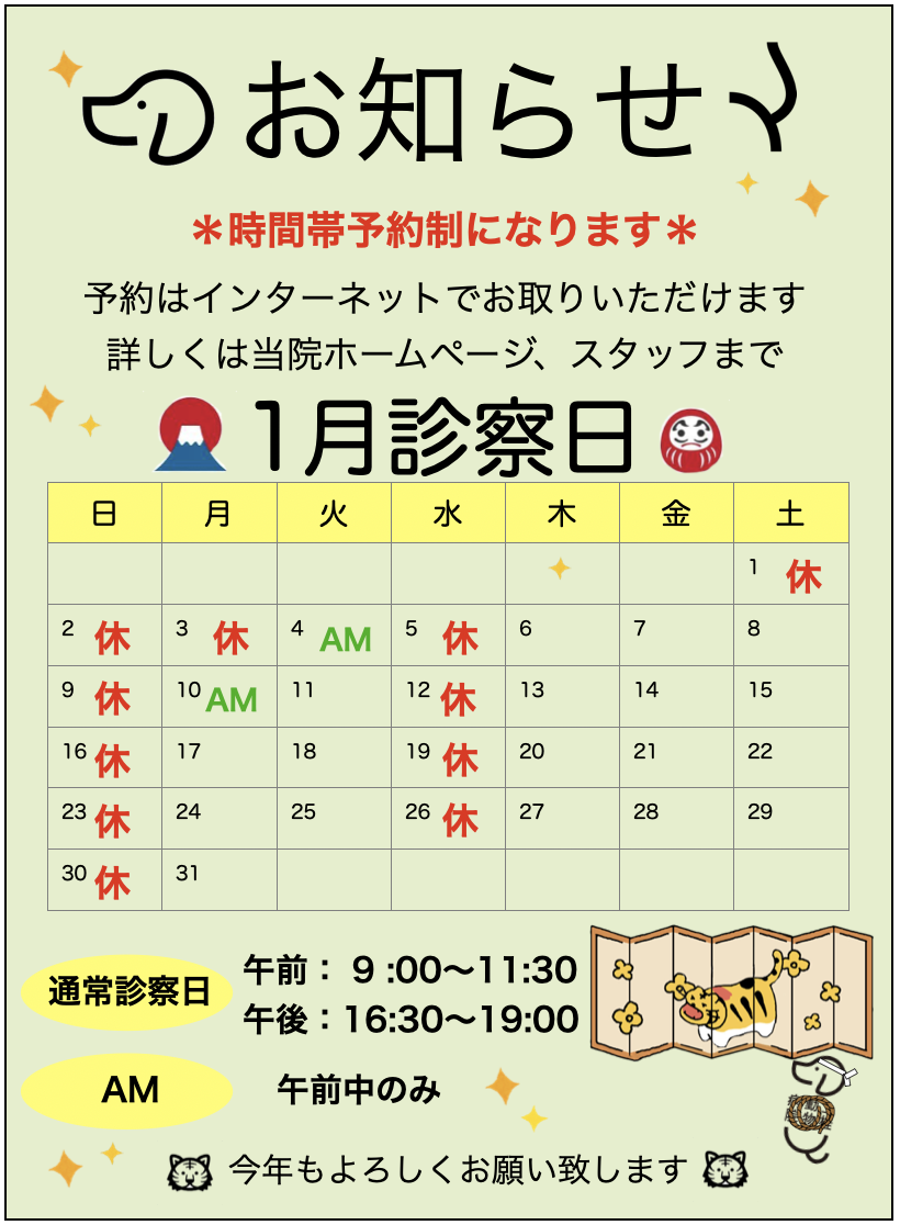 1月の休診日のお知らせ 2021.11.29 | 上桂だより 1月の休診日は上記カレンダーの通りとなります。 ご予約はホームページからもお取りできます。ご不明点などがございましたらお気軽にお問い合わせ下さい。