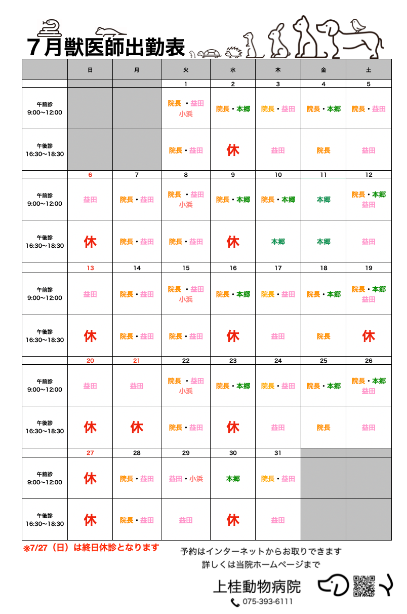 各獣医師の院外での研修や緊急手術により急な変更がある場合がございます。