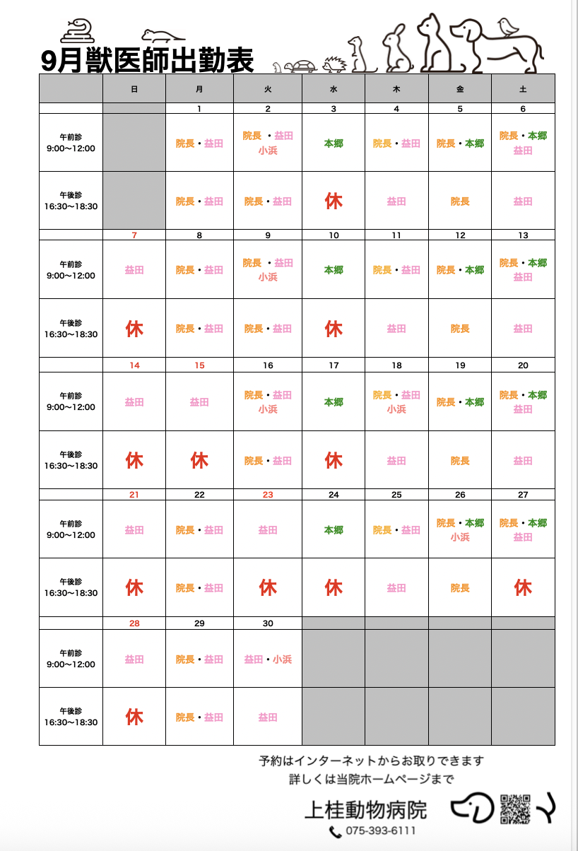 9月の休診日及び各獣医師の出勤日はカレンダーの通りでございます。