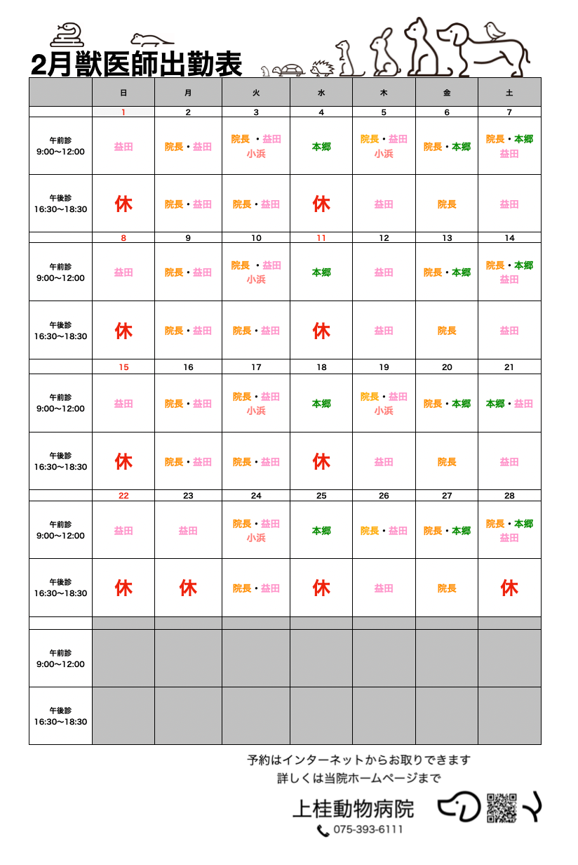 2月の休診日及び各獣医師の出勤日はカレンダーの通りでございます。