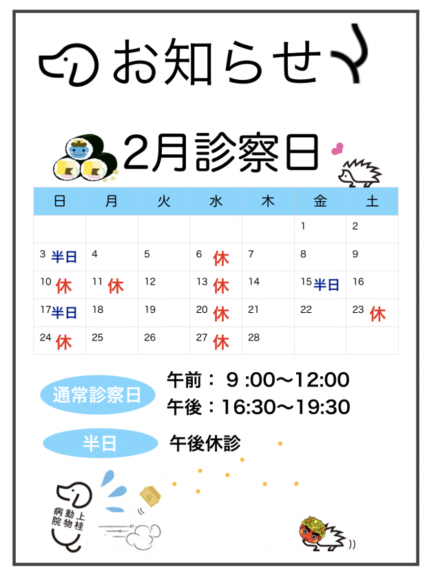 2月臨時休診のおしらせ 2019.01.24 | 上桂だより 2月の診察日は上記の通りとなります。 また、2/9(土)は夜間救急運営委員会の為、午後の診察受付けを19:00までとさせて頂きます。 ご迷惑おかけしますが、ご了承頂きますようよろしくお願いいたします。