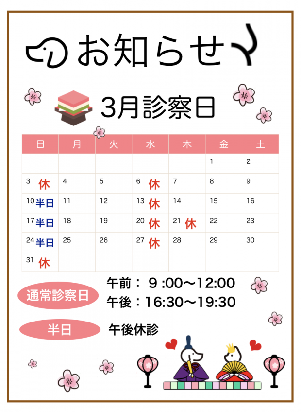 3月臨時休診のおしらせ 2019.02.23 | 上桂だより 3月3日(日)、21日(祝)は日本臨床獣医学フォーラム京都地区大会、日本獣医エキゾチック動物学会症例検討会の為臨時休診とさせて頂きます。 また、3月31日(日)は京都動物フォーラム2019が開催されます。今年から梅小路公園での開催となりますのでどうぞ皆様お誘い合わせの上是非ご参加ください。