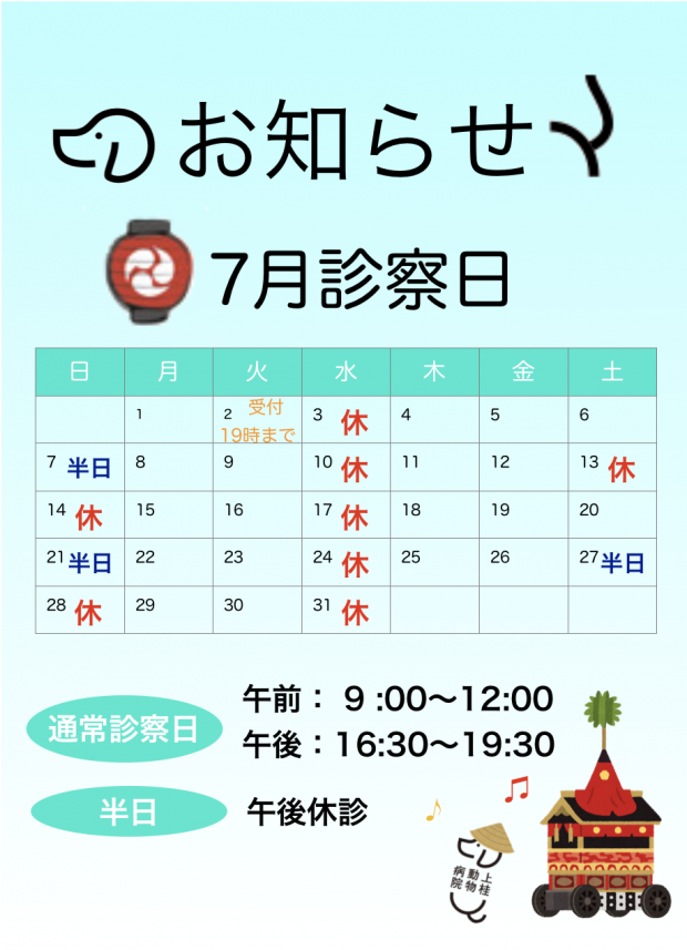 7月臨時休診のおしらせ 2019.06.23 | 上桂だより 7/13(土)、7/14(日)、7/27(土)PM、7/28(日)はWJVF、日本獣医エキゾチック動物学会の為、臨時休診とさせて頂きます。 また、7/2(火)は午後の診察受付を19:00までとさせて頂きます。 いつもご迷惑をおかけしますが、ご了承頂きますよう何卒よろしくお願いいたします。