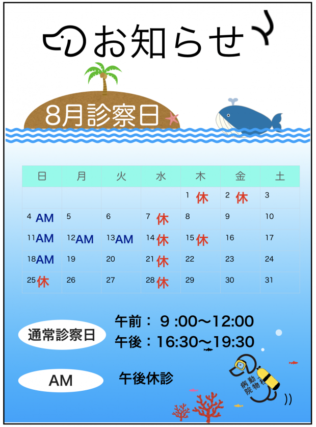8月臨時休診のおしらせ 2019.07.20 | 上桂だより 8/1(木)、2(金)、15(木)、25(日)はセミナー参加、お盆休みなどの為臨時休診とさせて頂きます。 また、12(月)、13(火)は午前の診察のみとなります。ご迷惑をおかけしますが何卒よろしくお願いいたします。