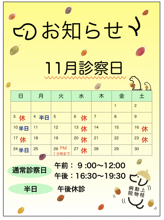 11月臨時休診のおしらせ 2019.10.28 | 上桂だより 11/3(日)、16(土)、17(日)、23(土)は動物臨床医学会、VSJサミットなど参加の為、臨時休診とさせて頂きます。ご迷惑おかけしますがよろしくお願い致します。 気温が下がってきました。犬、猫の下痢、嘔吐など、鳥の呼吸器症状などのご相談が増えています。飼育環境を今一度チェックしてみてあげてください。