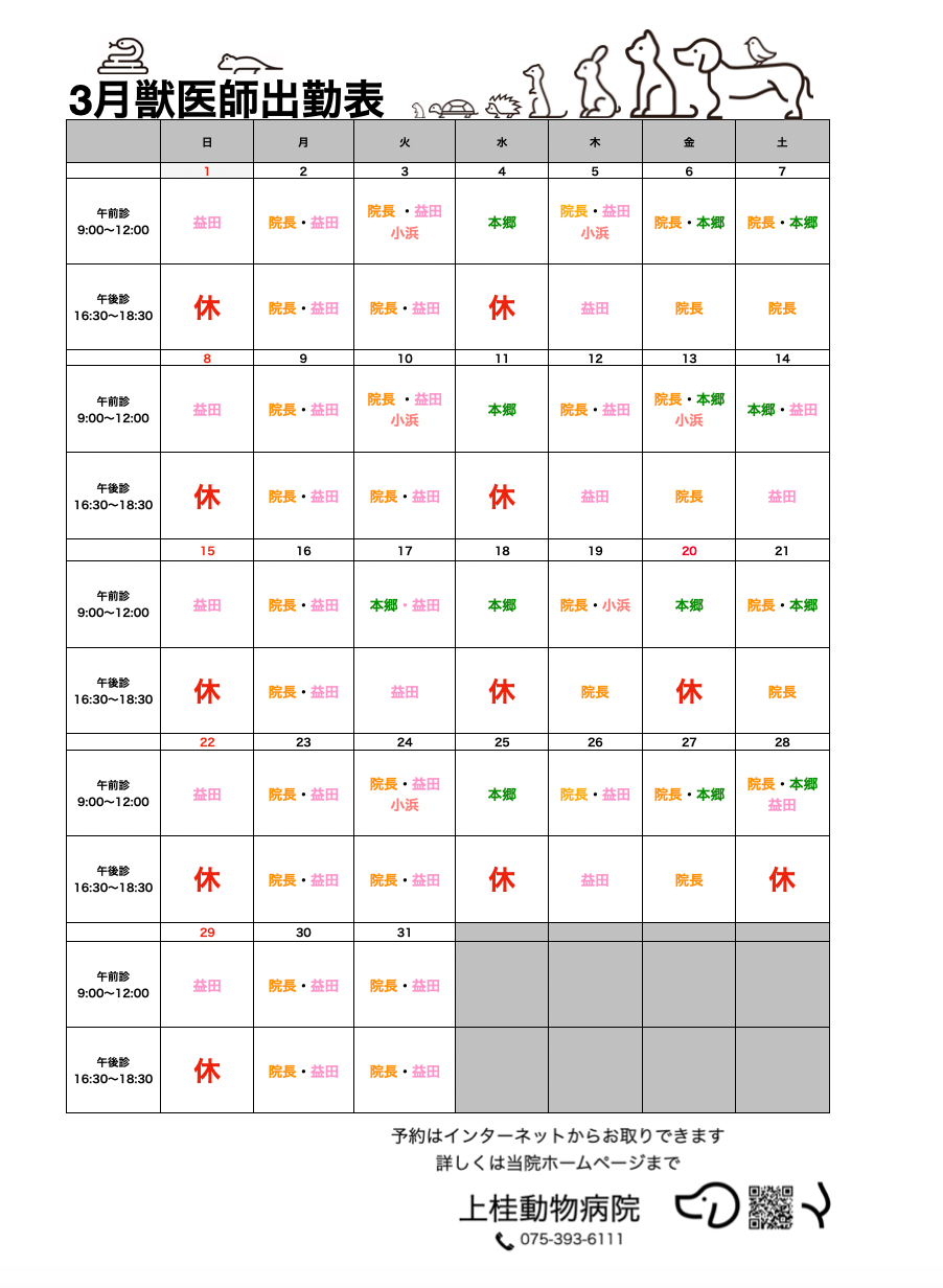3月の休診日及び各獣医師の出勤日はカレンダーの通りでございます。