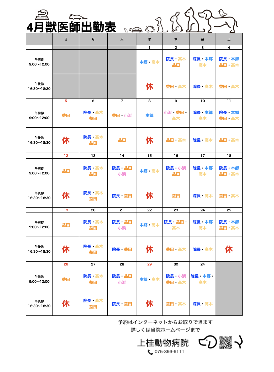 4月の休診日及び各獣医師の出勤日はカレンダーの通りでございます。